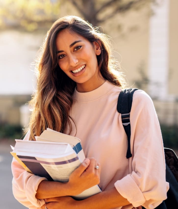 Young woman of color standing and facing the camera with a backpack on holding books in her hands